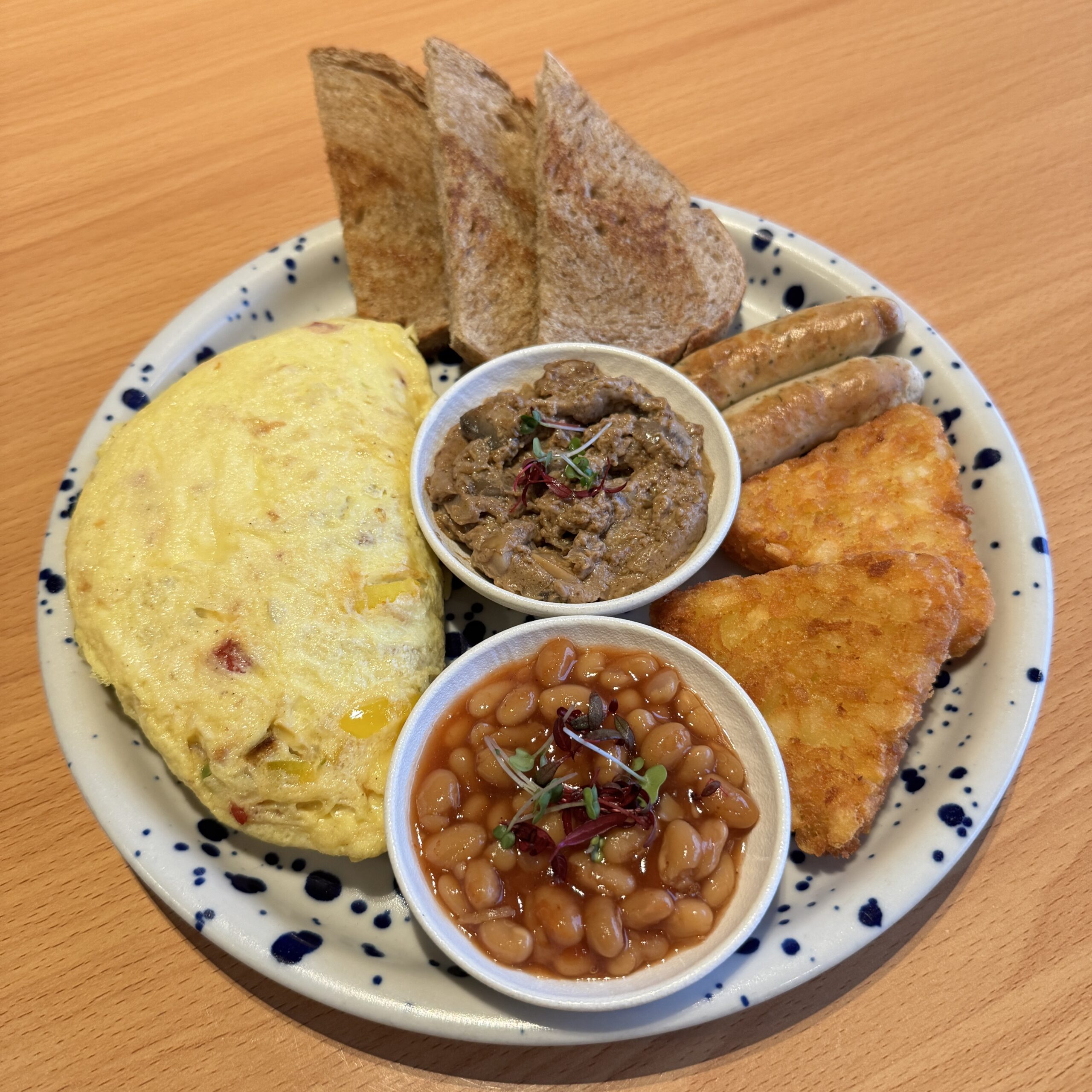 Laura English Breakfast: a hearty morning feast featuring chicken sausage, savory beef pastrami, golden hash browns, and classic baked beans, all served alongside a fluffy vegetable cheese omelette and toasted oval bread. A wholesome sunrise on a plate.